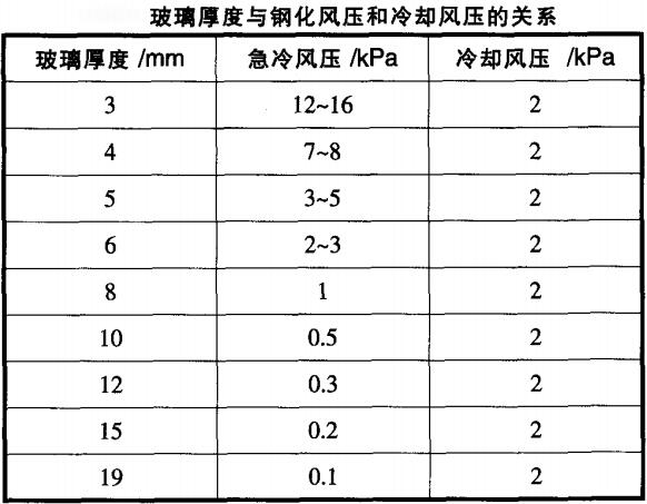 玻璃鋼化爐的鋼化風壓是鋼化工藝參數中為重要的工藝參數之,鋼化風壓對玻璃的鋼化程度與鋼化果產生直接的影響,鋼化風壓的設定方面依據玻璃的厚度,玻璃越薄,對鋼化風壓的要求就越高,鋼化風壓設置過大會導致玻璃的自爆幾率的升高;另方面也要參考玻璃的顏色、玻璃的開孔開槽狀態(tài)。鋼化風壓的調節(jié)可以在計算機上進行控制,但上風柵的風壓與下風柵的風壓調節(jié)般需要對上下風路中心位置的導流板進行調整,導流板位于上下風路的中心位置,用來調節(jié)上風柵風壓與下風柵風壓的大小,向上調是加大上風柵的風壓減小下風柵 的風壓,向下調是加大下風柵的壓力和減小上風柵的風壓。冷卻風壓的主要作用在于降低鋼化后玻璃的溫度,對玻璃的鋼化程度不會產生影響,不同厚度玻璃的鋼化風壓和冷卻風壓 ,可參照下表。